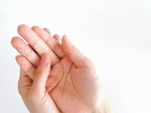 付け根に右手をあてて